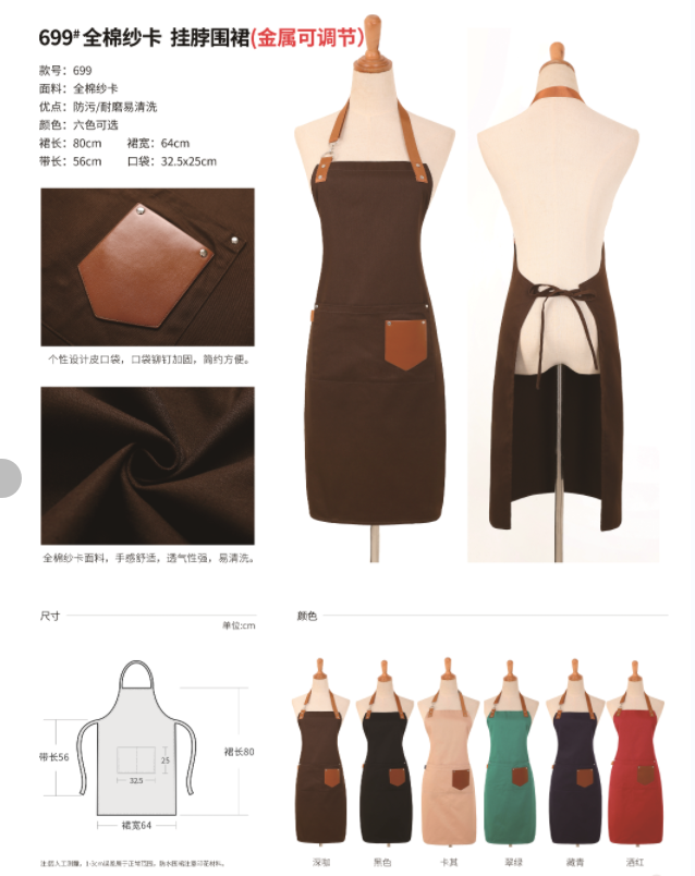其次,全棉紗卡掛脖圍裙的定制過程,也是其獨特魅力的一部分??蛻艨梢愿鶕?jù)自己的喜好,選擇圍裙的顏色、圖案,甚至刺繡等細節(jié),實現(xiàn)真正的個性化定制。這樣的定制服務,不僅滿足了客戶的個性化需求,更使得每一件定制的圍裙,都成為了一個獨一無二的藝術(shù)品。