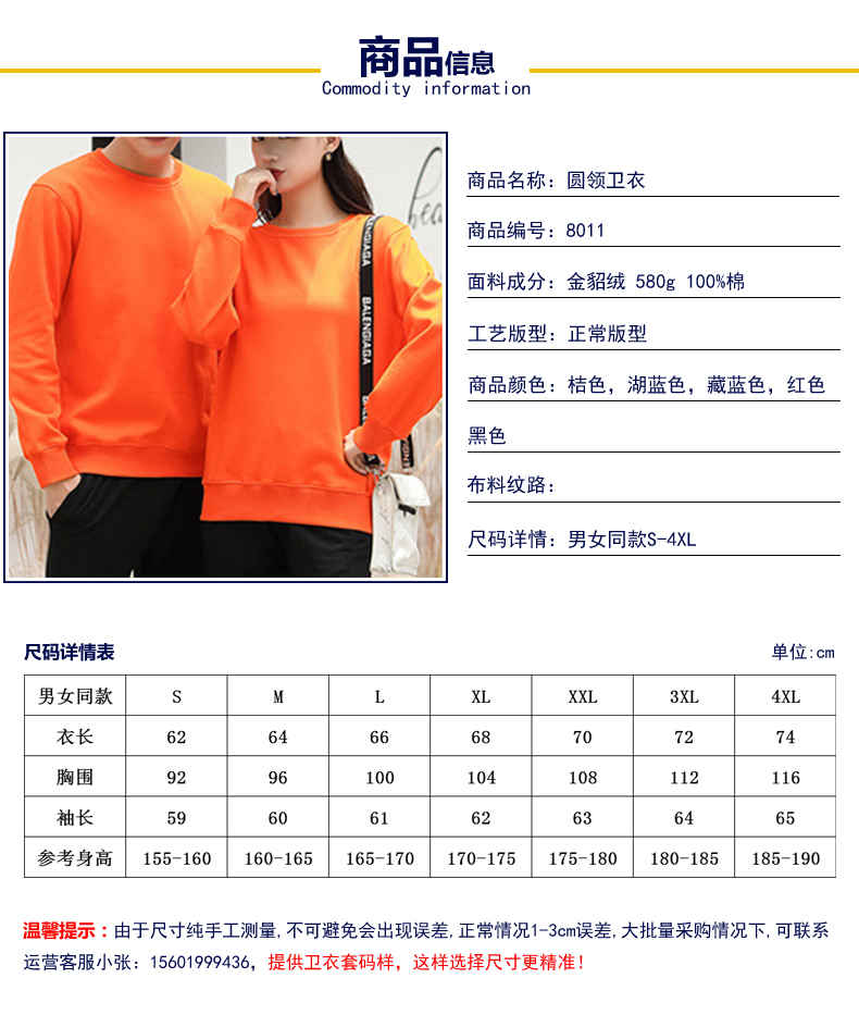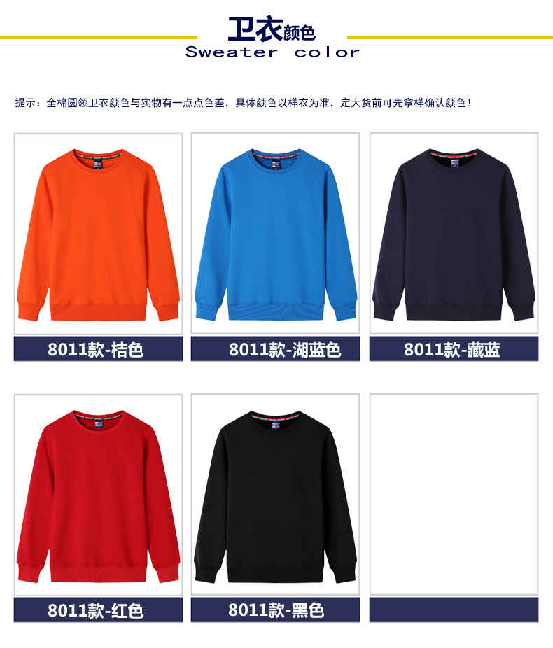 | 產(chǎn)品名稱:全棉圓領衛(wèi)衣定做 | 型號:8011 |